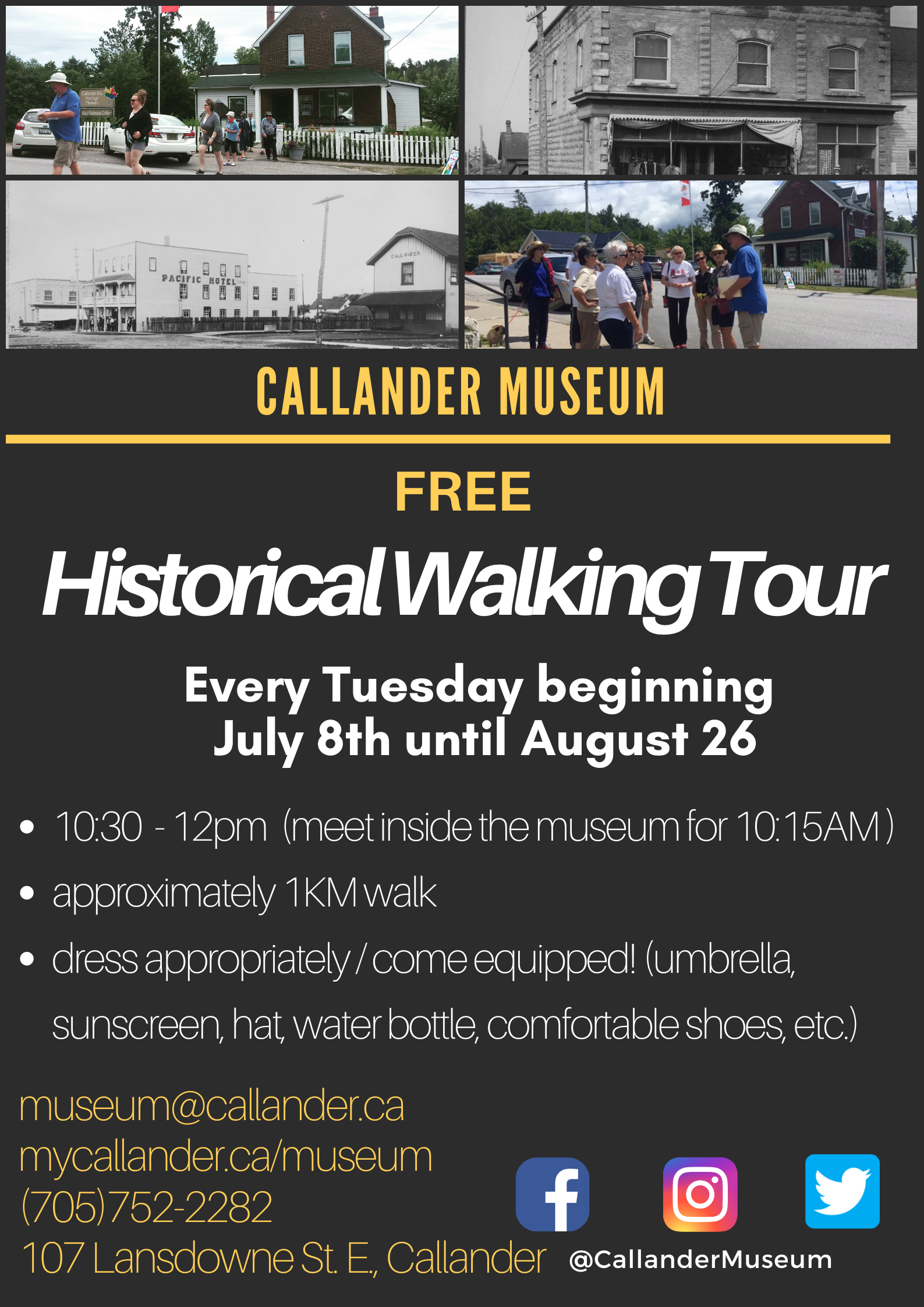 Join us at the Callander Bay Heritage Museum & Alex Dufresne Gallery on Tuesdays from July 8 until August 26, 2025 for a FREE Historical walking Tour. Please meet inside the museum at 10:15 a.m. The 1KM walk starts at 10:30 a.m. and concludes at 12p.m. All participants on the walking tour are offered a reduced admission fee to the museum following the tour. Dress appropriately/come equipped for the weather (umbrella, sunscreen, hat, water bottle, comfortable shoes, etc.) No reservation required. If you have any questions, please call 705-752-2282 or email museum@callander.ca.