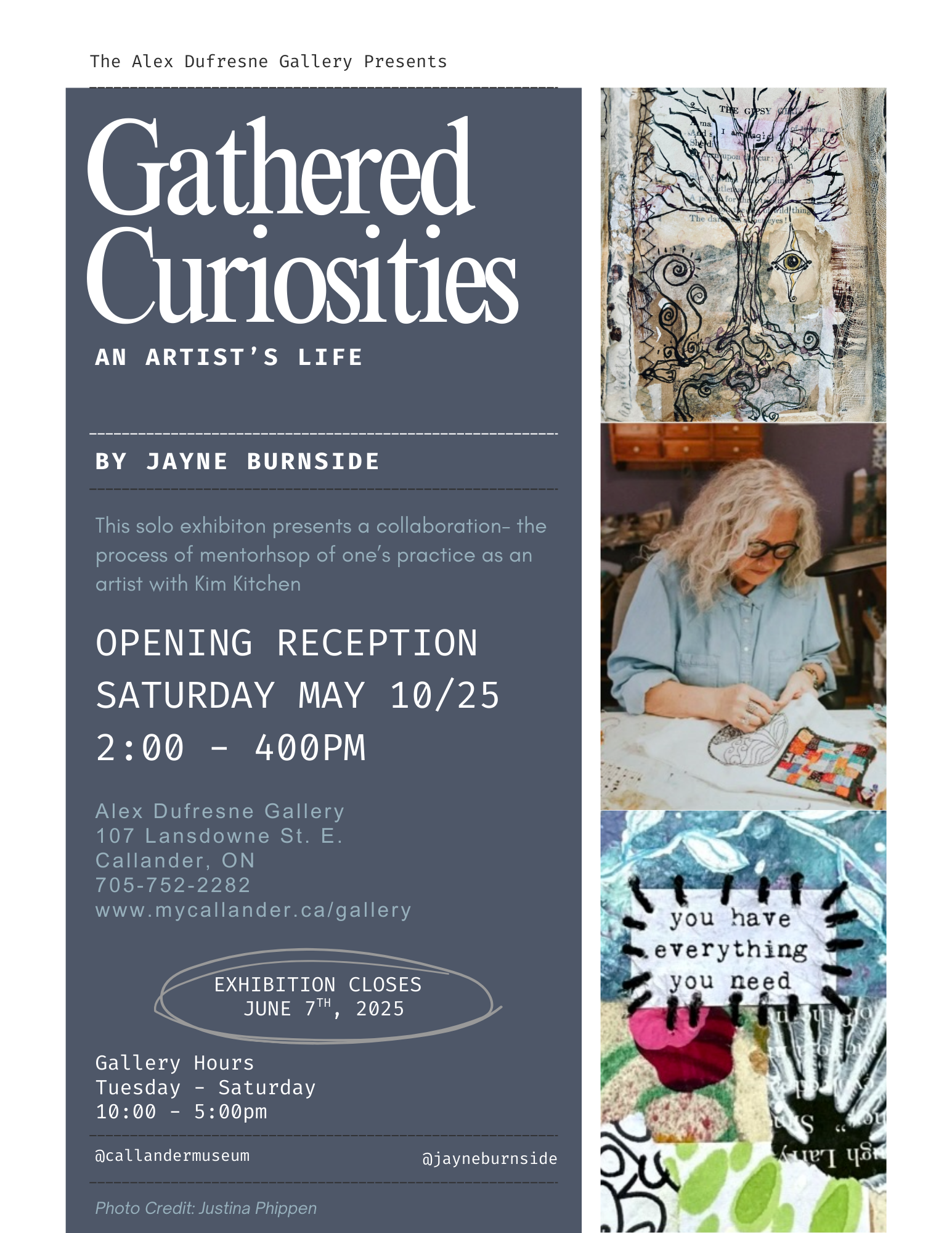 The Callander Bay Heritage Museum & Alex Dufresne Gallery is pleased to announce its new art exhibition “Gathered Curiosities, this show represents a collaborative work through the process of mentorship of one’s practice from artist Jayne Burnside and mentor Kim Kitchen. There will be an opening reception on Saturday May 10th from 2:00 – 4:00pm and the artist will be present. There will be light refreshments and free museum admission.