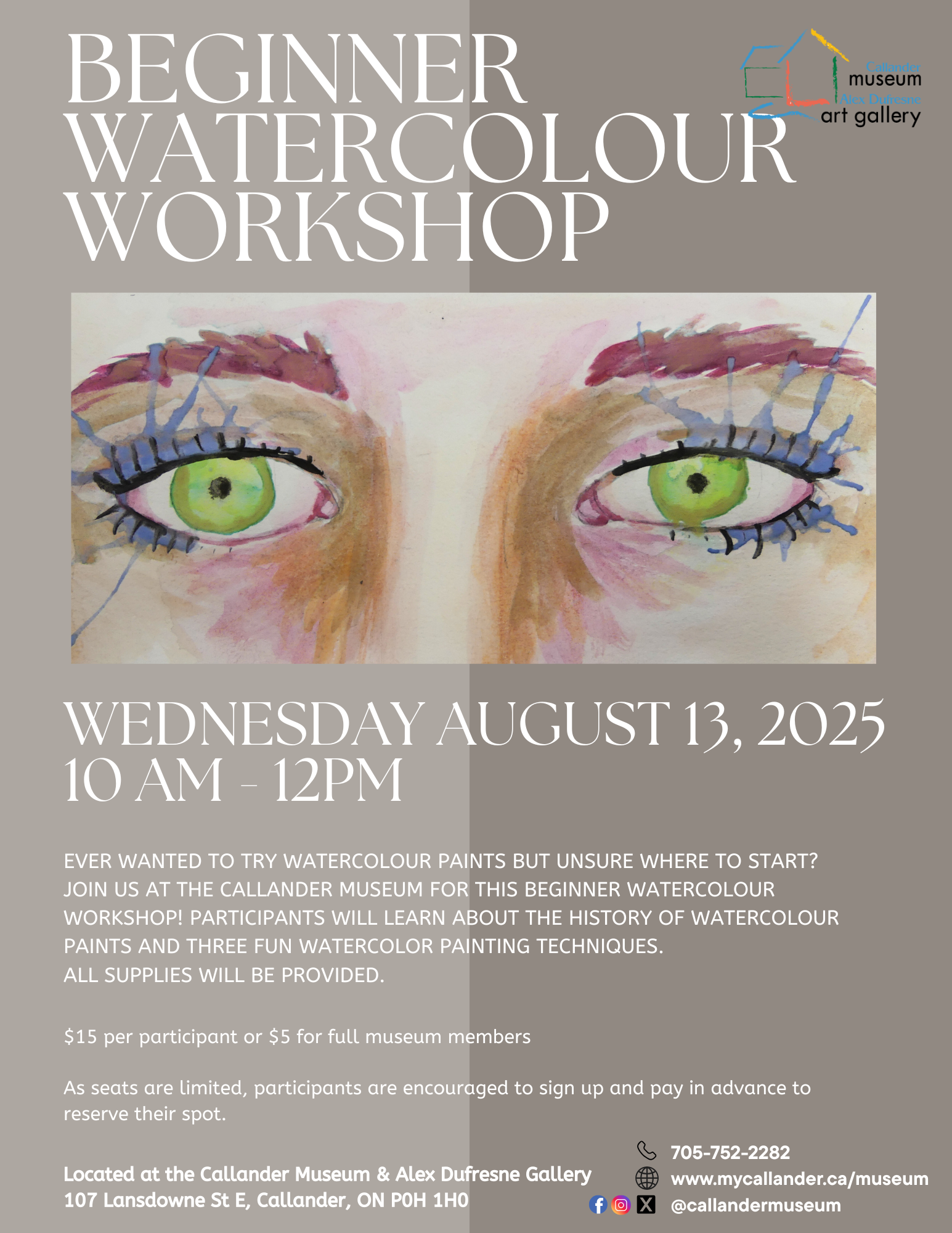 Ever wanted to try watercolour paints, but were unsure of where to start? Join us at the Callander Museum & Alex Dufresne Gallery for this Beginning Watercolour Workshop! Participants will learn about the history of watercolour paints and three fun watercolour painting techniques. All supplies provided. $15 per participant or $5 for full museum members. As seats are limited, participants are encouraged to sign up and pay in advance to reserve their spot, please email us at museum@callander.ca or call us at 705-752-2282.